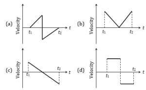 A batsman hits a sixer and the ball touches the ground outside the cricket ground. Which of the following graph describes the variation of the cricket ball’s vertical velocity v with time between the time t1 as it hits the bat and time t2 when it touches the ground